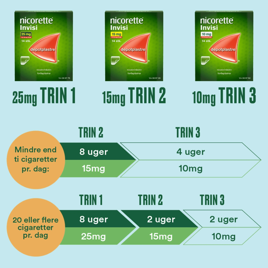 25 mg Nicorette® Invisi nikotinplaster passer til dig, der ryger 20 cigaretter eller flere om dagen. Rygere, som ryger færre end 20 cigaretter om dagen, bør starte med vores 15 mg plaster.